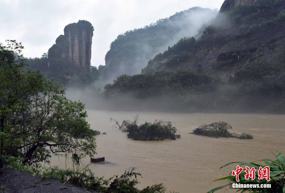 7月9日,武夷山玉女峰前九曲溪水位暴涨,淹及沿岸树木。中新社记者 张丽君 摄