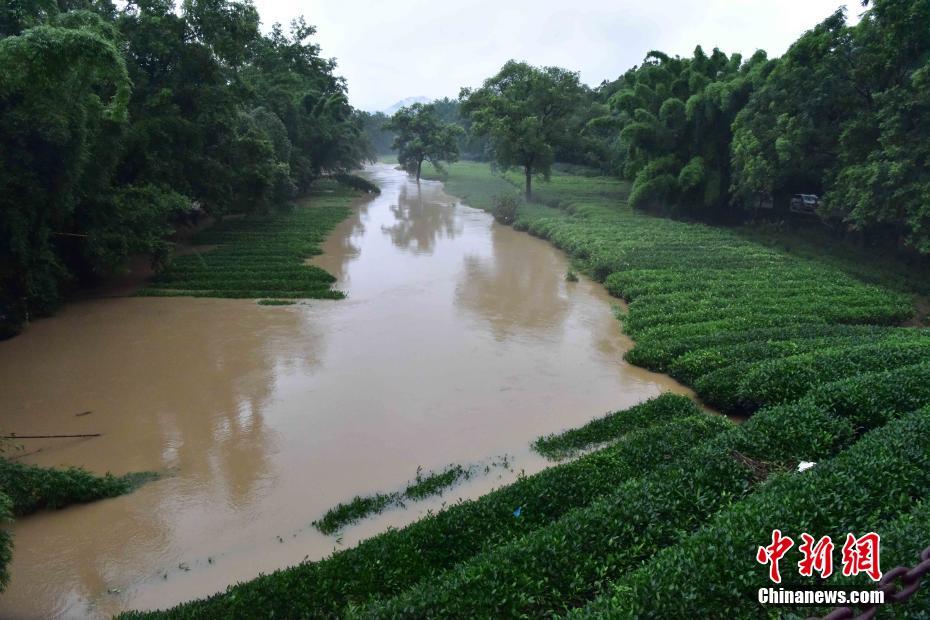 7月9日,武夷山一茶园过水。9日凌晨1点30分左右,武夷山景区内开始普降暴雨,6点58分九曲溪水位达到最高峰197.09米(超禁航水位5.39米),5点30分景区向社会发布闭园信息,暂停游客游览。中新社记者 张丽君 摄