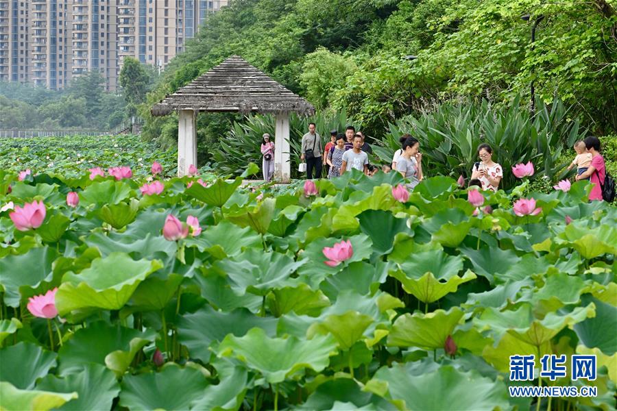 7月9日,福州金山公园内荷花竞相绽放,吸引游人赏荷休闲。 近日,福州各公园内的荷花进入盛花期,吸引游人前来赏荷、拍照。 新华社记者 姜克红 摄