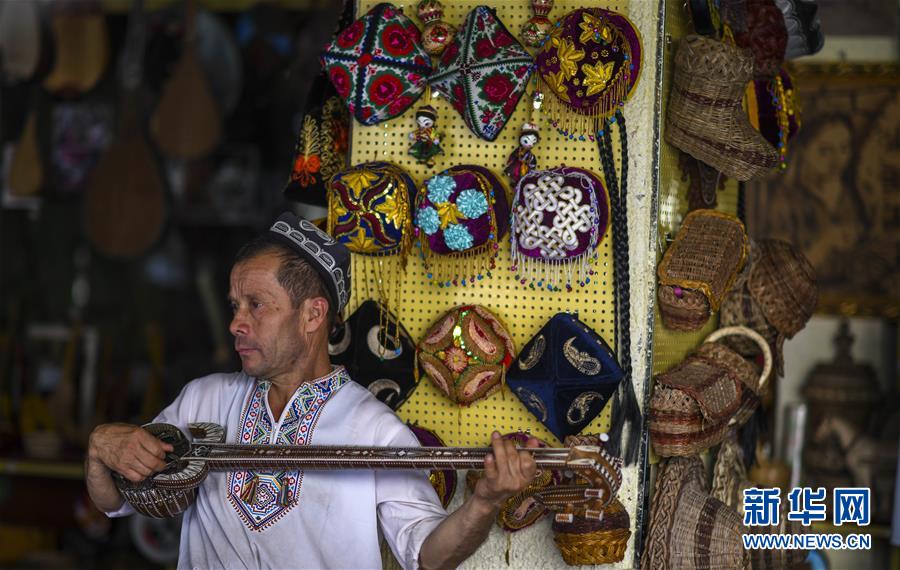 喀什古城景区“老城艾山玉山手工木器艺术品展览店”店主玉买尔江·玉山在弹奏民族乐器(7月8日摄)。 新疆素有“歌舞之乡”美誉。在喀什古城景区里,歌舞也是当地人民生活中不可缺少的一部分。欣赏独具风情的歌舞也成了游客们游览古城的重要内容。 2019年喀什古城景区旅游发展迅速。景区管委会提供的数据显示,上半年古城景区接待游客人数超过31万人次,同比增长超过九成。 新华社记者 赵戈 摄