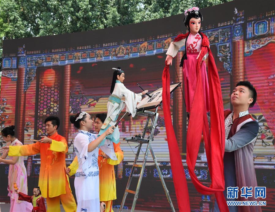 7月11日,演员在“广东日”活动中表演木偶戏《木偶书法》。 当日,2019年中国北京世界园艺博览会“广东日”活动在北京世园会园区举行。 新华社发(任超摄)