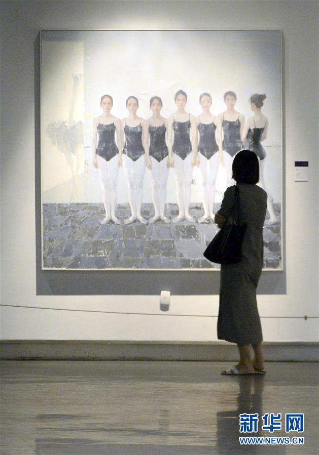 7月12日,观众在展览上欣赏油画作品《第八个舞者》。 当日,“大潮涌进”浙江省第十四届美术作品展览”在浙江美术馆开幕。本届展览共展出作品600余件,涵盖中国画、油画、版画、陶艺、实验艺术等门类,其中获浙江美术奖金奖的作品10件。 新华社发(施健学摄)
