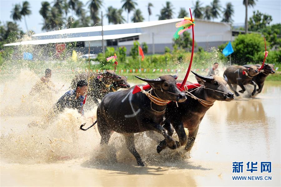 7月13日,在泰国春武里府赛牛节上,参赛者驾驭水牛参加比赛。