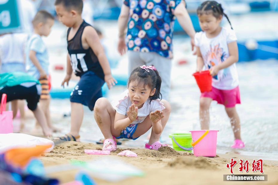 7月13日,哈尔滨市民纷纷来到松花江边夏季公益浴场戏水纳凉。图为孩子们在浴场岸边玩沙子。中新社记者 吕品 摄