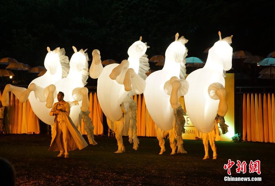 7月14日晚,马来西亚乔治市艺术节“夜幕降临”灯光秀继续进行。一年一度的乔治市艺术节今年共吸引来自20多个国家和地区的艺术家们献技。图为五匹“白马灯”齐扬蹄。中新社记者 陈悦 摄