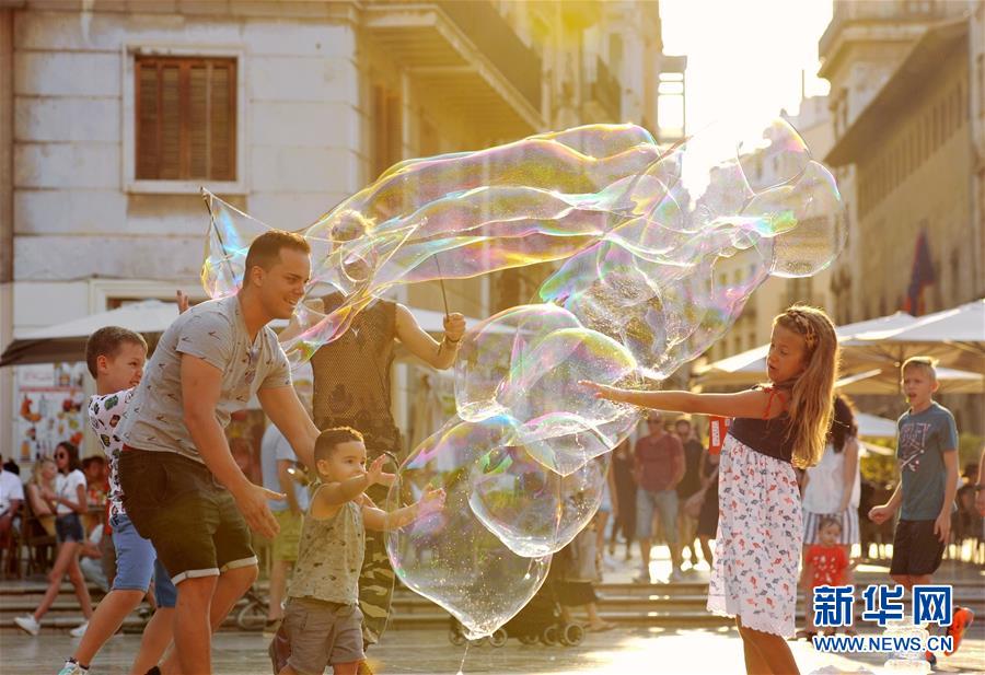 7月14日,在西班牙巴伦西亚,孩子们在一处广场上玩肥皂泡。 西班牙巴伦西亚紧靠大海,一年四季气候宜人。时值盛夏,游客纷纷来到这里度假,与当地居民一起享受悠闲夏日。 新华社记者 郭求达 摄