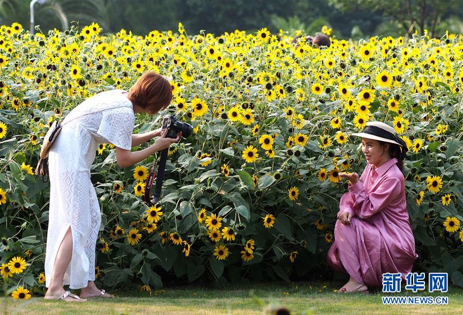 7月14日,游客在上海南园滨江绿地拍照留念。新华社记者 陈飞 摄