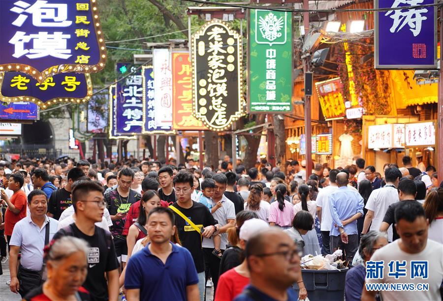 7月19日,游客在西安回民街上游览。 暑期以来,西安市各大旅游景点人气火爆。大量游客前来游览历史文化景区,品尝传统特色美食,感受千年古都厚重与时尚交融的独特魅力。 新华社记者 邵瑞 摄
