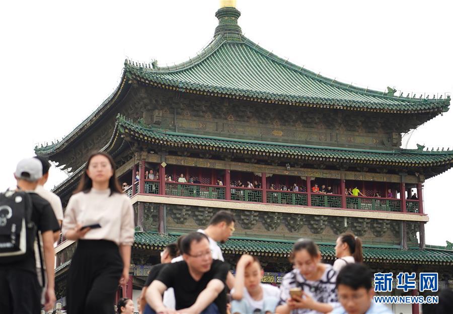 7月19日,游客在西安钟楼上游览。 暑期以来,西安市各大旅游景点人气火爆。大量游客前来游览历史文化景区,品尝传统特色美食,感受千年古都厚重与时尚交融的独特魅力。 新华社记者 邵瑞 摄