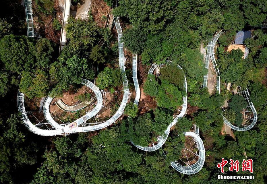 7月21日,福建尤溪,游客在侠天下景区体验别具特色的“天空漂流”。“天空漂流”是一条全长1680米的高空玻璃水滑道漂流项目,落差约200米。图为航拍“天空漂流”玻璃栈道。中新社记者 王东明 摄