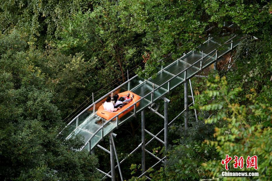 7月21日,福建尤溪,游客在侠天下景区体验别具特色的“天空漂流”。“天空漂流”是一条全长1680米的高空玻璃水滑道漂流项目,落差约200米。中新社记者 王东明 摄