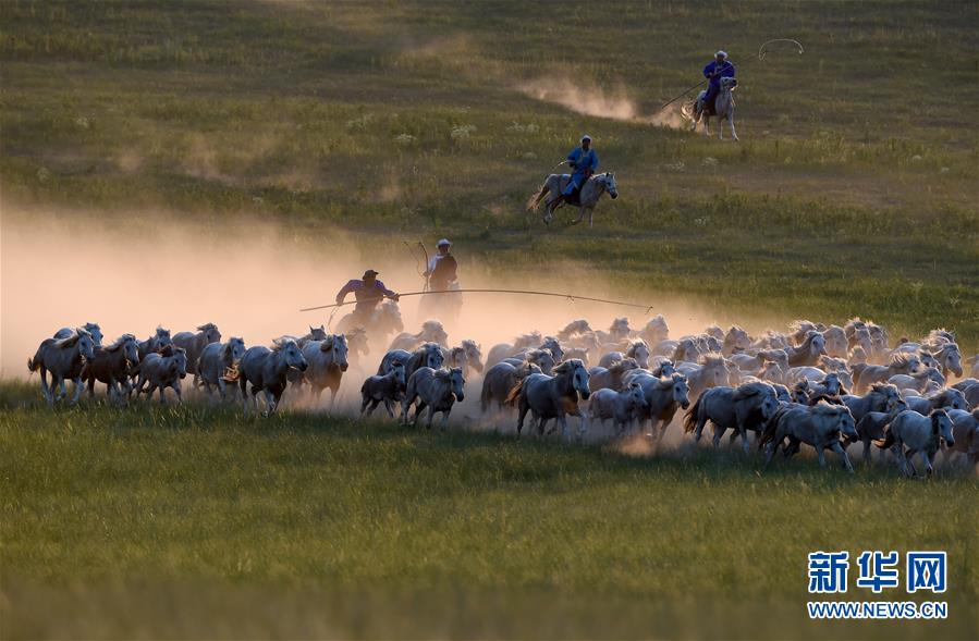 7月21日,几名套马手正在套马。 当日,内蒙古西乌珠穆沁旗在巴彦胡舒苏木白马繁育基地的草原上进行套马活动,向广大游客展示蒙古族高超的套马技艺和独具风情的草原民俗文化。 新华社记者任军川摄