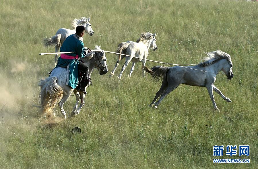 7月21日,一名套马手正在套马。 当日,内蒙古西乌珠穆沁旗在巴彦胡舒苏木白马繁育基地的草原上进行套马活动,向广大游客展示蒙古族高超的套马技艺和独具风情的草原民俗文化。 新华社记者任军川摄