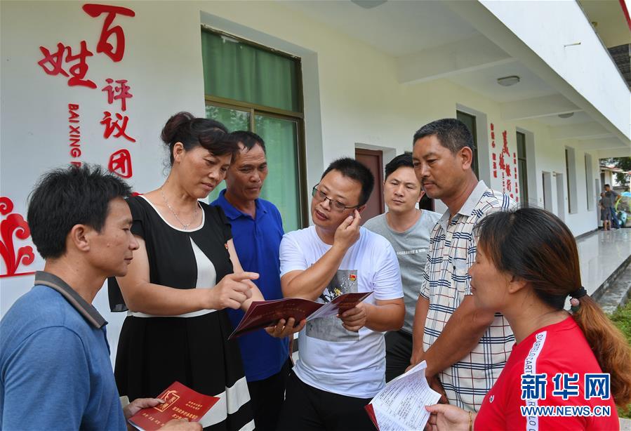 7月19日,武夷山市兴田镇西郊村百姓评议成员对村民家庭表现情况进行月评。 近年来,福建省武夷山市兴田镇西郊村通过建立“美德银行”,围绕村庄人居环境、孝廉文化、产业发展、乡村文明等内容,实行一户一卡,对村民行为规范和表现情况以计分的形式进行每月综合评分,并将每户每月得分存入“美德银行”卡,年终进行总评表彰,鼓励村民讲正气、讲道德、树新风,促进农村健康和谐发展。 新华社记者 张国俊 摄