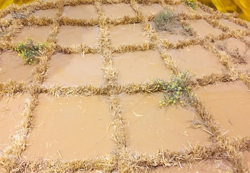 黄沙上铺上一米见方的麦草格子