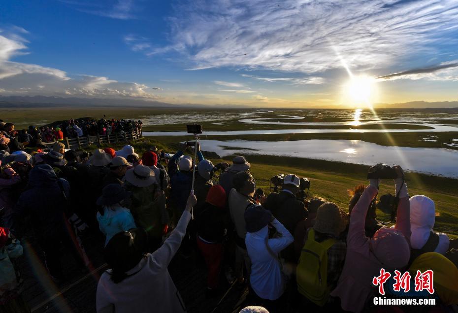 穿越新疆天山,连接南北疆的独库公路全长500余公里,这是一条翻山越岭的奇迹险路,沿途三分之一的路段旁是万丈悬崖,五分之一的路段地下是高山永冻层。它的贯通,使得南北疆路程由原来的1000多公里缩短了近一半。“一路观四季、十里不同天”,独库公路横亘崇山峻岭、穿越深山峡谷,沿途经过独山子大峡谷、乔尔玛、唐布拉、那拉提、巴音布鲁克等多个景区,成为自驾游的天堂。而这条公路特殊之处在于它每年对外开放的时间只有5个月,其他时间均处于封闭状态。今年的7月12日,2019新疆特种旅游节暨中国最美独库公路自驾活动在新疆库尔勒市举行发车仪式,来自重庆、四川、北京及新疆各地的百余辆自驾车辆相约共同穿越独库公路。图为7月13日傍晚,新疆巴音布鲁克草原,游客在景区观景台欣赏、拍摄开都河九曲十八弯日落美景。中新社记者 刘新 摄