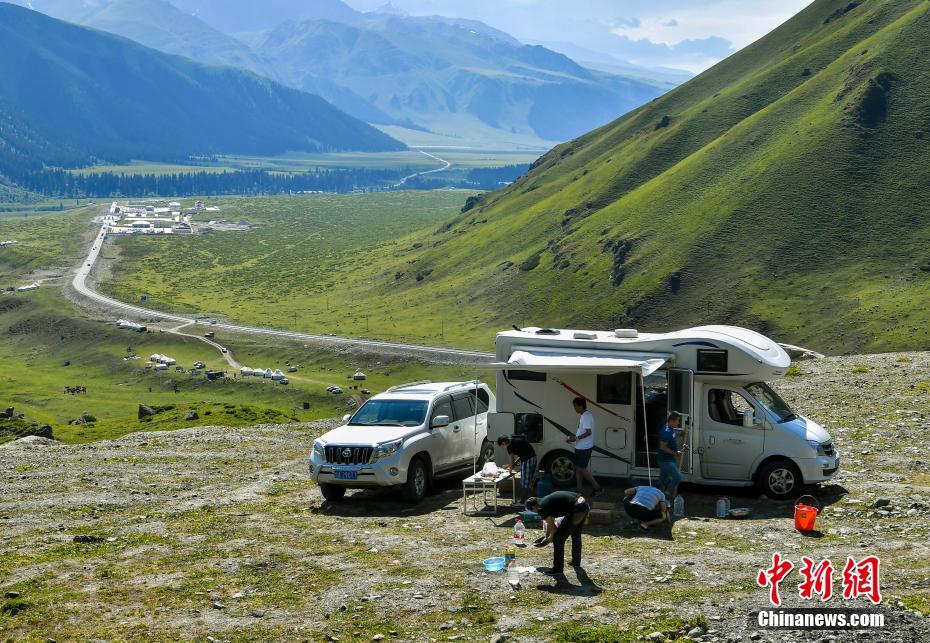 穿越新疆天山,连接南北疆的独库公路全长500余公里,这是一条翻山越岭的奇迹险路,沿途三分之一的路段旁是万丈悬崖,五分之一的路段地下是高山永冻层。它的贯通,使得南北疆路程由原来的1000多公里缩短了近一半。“一路观四季、十里不同天”,独库公路横亘崇山峻岭、穿越深山峡谷,沿途经过独山子大峡谷、乔尔玛、唐布拉、那拉提、巴音布鲁克等多个景区,成为自驾游的天堂。而这条公路特殊之处在于它每年对外开放的时间只有5个月,其他时间均处于封闭状态。今年的7月12日,2019新疆特种旅游节暨中国最美独库公路自驾活动在新疆库尔勒市举行发车仪式,来自重庆、四川、北京及新疆各地的百余辆自驾车辆相约共同穿越独库公路。图为7月15日,来自陕西的自驾游旅客,在独库公路边的一处空旷地带驻车,准备晚餐,并在此露营。中新社记者 刘新 摄