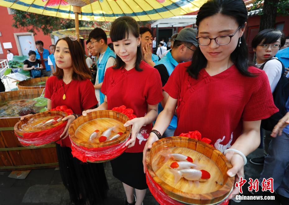 7月30日,“观鱼知乐——宫廷金鱼文化与故宫博物院藏金鱼题材文物联展”在北京故宫延禧宫开幕,吸引了众多游客参观。此次金鱼展共展出来自北京、上海、天津、武汉、南京、福州、苏州等12个地区42个品种的近200条宫廷金鱼,很多都是难得一见的珍品。其中鹅头红、王字虎头、奶牛花兰寿、十二红龙睛蝶舞、雪青望天球等品种十分罕见。展出使用传统木海,排放在延禧宫灵沼轩侧。故宫博物院藏金鱼题材文物展位于延禧宫东侧一层展厅,展出金鱼题材文物藏品34件(套)。图为木海里的金鱼。中新社记者 杜洋 摄