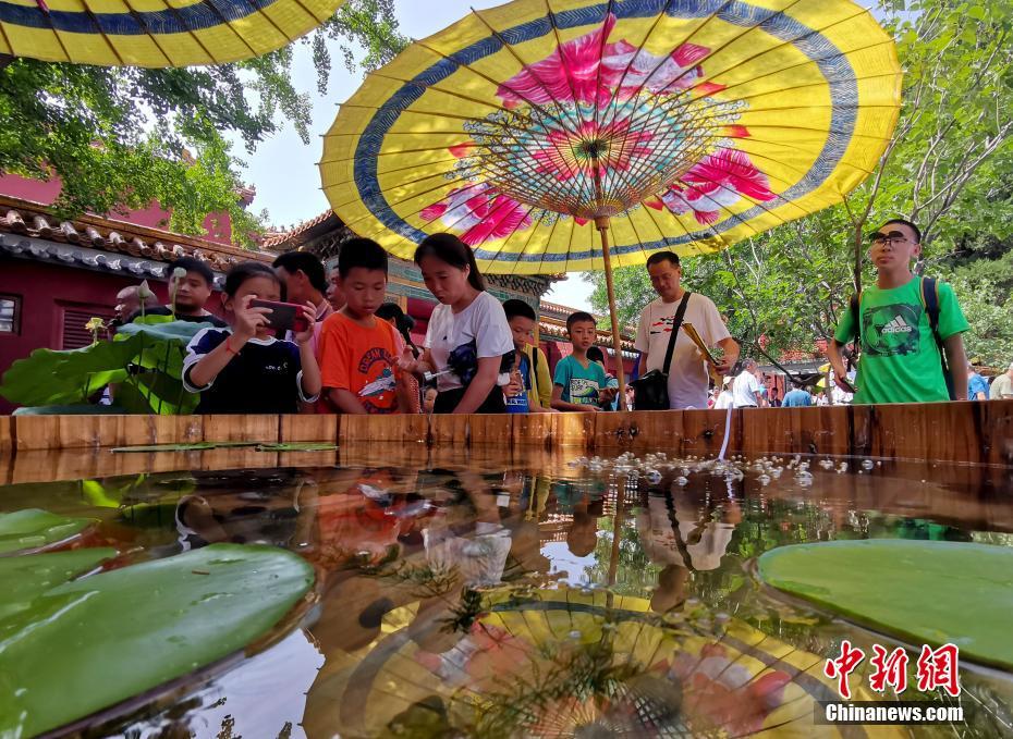 7月30日,“观鱼知乐——宫廷金鱼文化与故宫博物院藏金鱼题材文物联展”在北京故宫延禧宫开幕,吸引了众多游客参观。此次金鱼展共展出来自北京、上海、天津、武汉、南京、福州、苏州等12个地区42个品种的近200条宫廷金鱼,很多都是难得一见的珍品。其中鹅头红、王字虎头、奶牛花兰寿、十二红龙睛蝶舞、雪青望天球等品种十分罕见。展出使用传统木海,排放在延禧宫灵沼轩侧。故宫博物院藏金鱼题材文物展位于延禧宫东侧一层展厅,展出金鱼题材文物藏品34件(套)。图为游客观赏金鱼。中新社记者 杜洋 摄