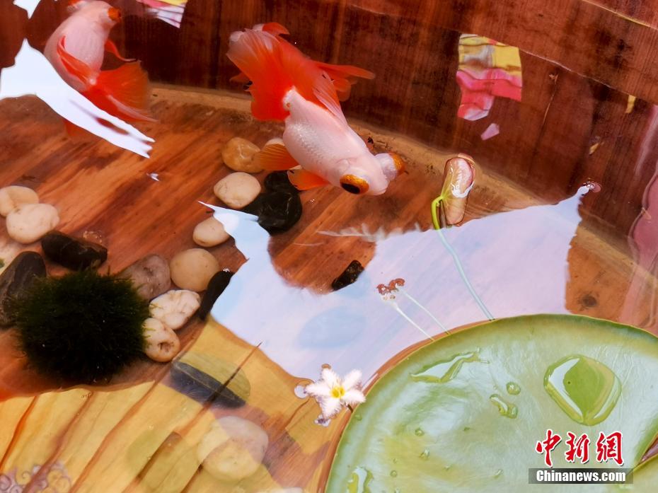 7月30日,“观鱼知乐——宫廷金鱼文化与故宫博物院藏金鱼题材文物联展”在北京故宫延禧宫开幕,吸引了众多游客参观。此次金鱼展共展出来自北京、上海、天津、武汉、南京、福州、苏州等12个地区42个品种的近200条宫廷金鱼,很多都是难得一见的珍品。其中鹅头红、王字虎头、奶牛花兰寿、十二红龙睛蝶舞、雪青望天球等品种十分罕见。展出使用传统木海,排放在延禧宫灵沼轩侧。故宫博物院藏金鱼题材文物展位于延禧宫东侧一层展厅,展出金鱼题材文物藏品34件(套)。图为木海里的金鱼。中新社记者 杜洋 摄