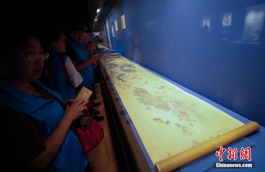 7月30日,“观鱼知乐——宫廷金鱼文化与故宫博物院藏金鱼题材文物联展”在北京故宫延禧宫开幕,吸引了众多游客参观。此次金鱼展共展出来自北京、上海、天津、武汉、南京、福州、苏州等12个地区42个品种的近200条宫廷金鱼,很多都是难得一见的珍品。其中鹅头红、王字虎头、奶牛花兰寿、十二红龙睛蝶舞、雪青望天球等品种十分罕见。展出使用传统木海,排放在延禧宫灵沼轩侧。故宫博物院藏金鱼题材文物展位于延禧宫东侧一层展厅,展出金鱼题材文物藏品34件(套)。图为展出的司马钟《荷花金鱼图卷》(清)。中新社记者 杜洋 摄