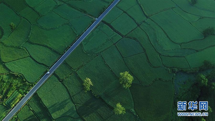 这是8月4日无人机拍摄的安徽黟县宏村风景区附近的农田。 盛夏时节,晨光中的安徽黟县宏村风景区呈现出一片迷人的景象,美不胜收。 新华社记者 张端 摄
