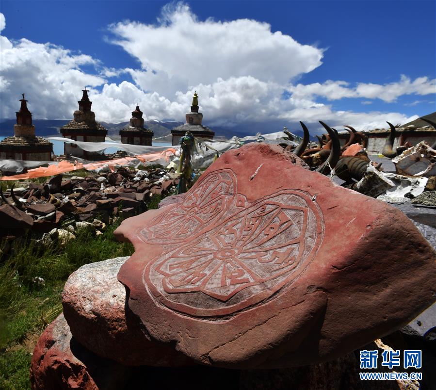 当惹雍错旁的象雄佛塔及经石(8月5日摄)。 西藏那曲市尼玛县位于西藏西北部,位于羌塘国家级自然保护区内,是古老象雄文明的发祥地之一。这里空气洁净,野生动物繁多,深受游客喜爱。 新华社记者 觉果 摄
