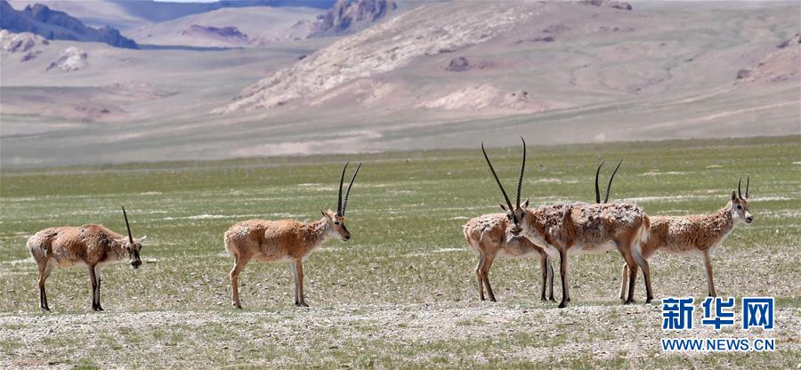8月4日,藏羚羊在觅食。 西藏那曲市尼玛县位于西藏西北部,位于羌塘国家级自然保护区内,是古老象雄文明的发祥地之一。这里空气洁净,野生动物繁多,深受游客喜爱。 新华社记者 觉果 摄