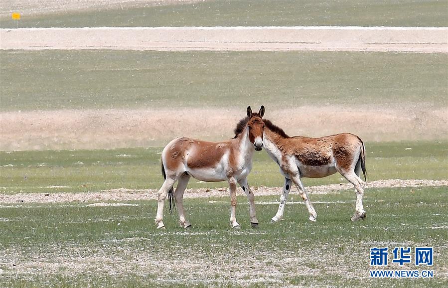 8月4日拍摄的两头藏野驴。 西藏那曲市尼玛县位于西藏西北部,位于羌塘国家级自然保护区内,是古老象雄文明的发祥地之一。这里空气洁净,野生动物繁多,深受游客喜爱。 新华社记者 觉果 摄