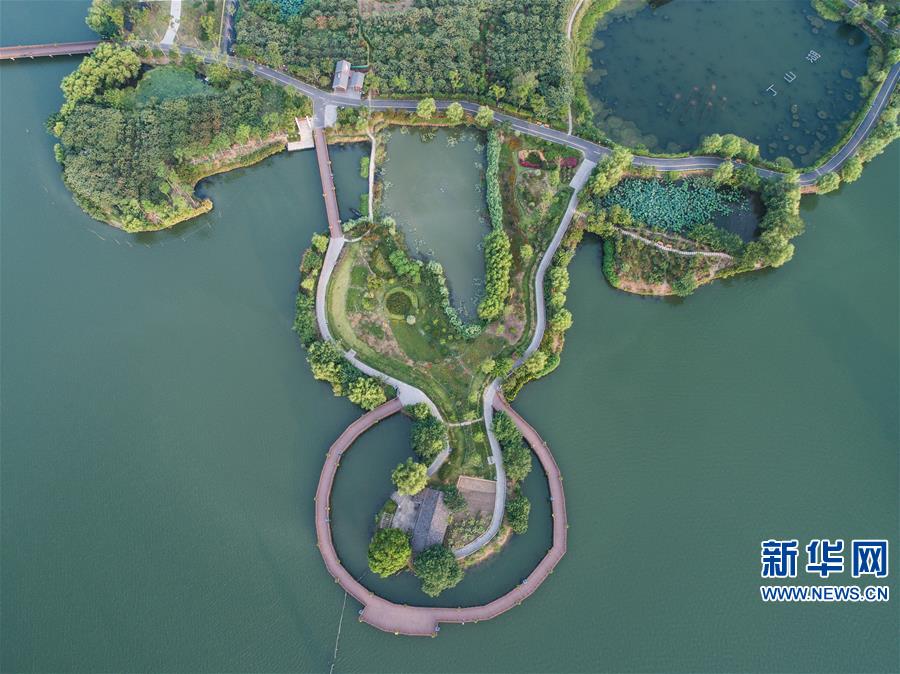 空中俯瞰塘栖镇丁山湖边的水上栈道(8月7日无人机拍摄)。 近年来,杭州市余杭区塘栖古镇将保护原生态自然景观与挖掘展现本地民俗文化相结合,通过新建一条长约10公里的水上栈道,将沿丁山湖的丁山河村、丁河村、超丁村等自然村连接起来,串联各村田园风光和湿地景观,做到一村一景一文化,四季有景色,村村有故事。目前,首期塘栖镇乡村美丽工程已经完工,水上栈道成为古镇村民在炎热夏季纳凉赏景的好去处,也让当地百姓享受到美丽乡村建设和乡村振兴带来的“福利”。 新华社记者 徐昱 摄