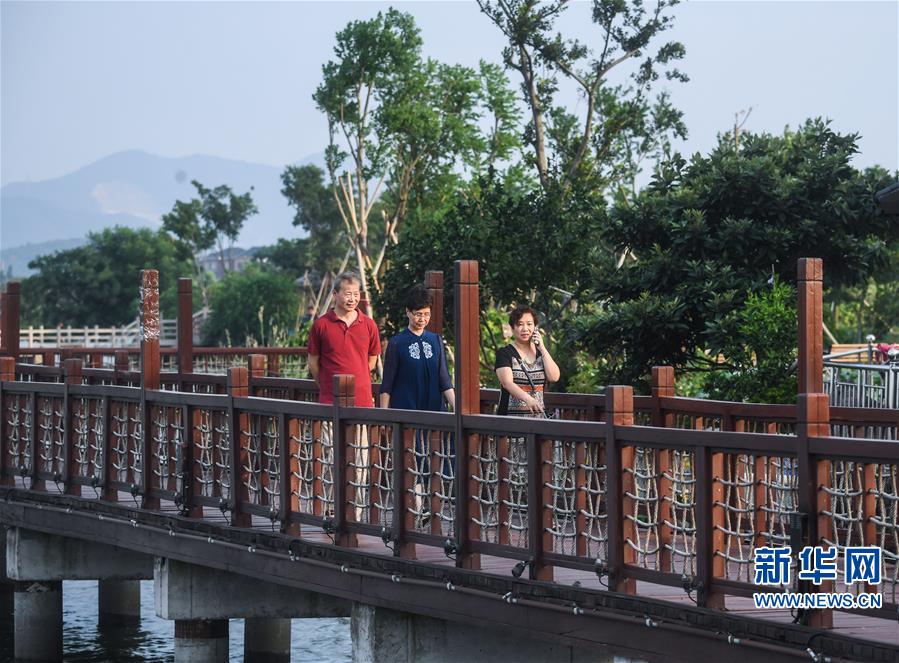 8月7日,百姓在塘栖镇丁山河村新建的水上栈道上散步休闲。 近年来,杭州市余杭区塘栖古镇将保护原生态自然景观与挖掘展现本地民俗文化相结合,通过新建一条长约10公里的水上栈道,将沿丁山湖的丁山河村、丁河村、超丁村等自然村连接起来,串联各村田园风光和湿地景观,做到一村一景一文化,四季有景色,村村有故事。目前,首期塘栖镇乡村美丽工程已经完工,水上栈道成为古镇村民在炎热夏季纳凉赏景的好去处,也让当地百姓享受到美丽乡村建设和乡村振兴带来的“福利”。 新华社记者 徐昱 摄