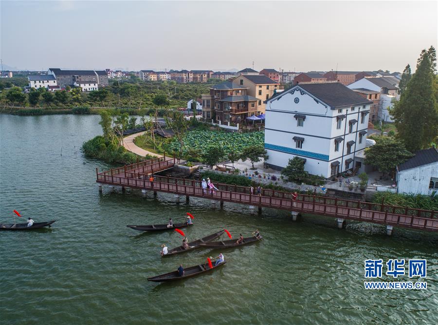 8月7日,塘栖镇丁山河村的百姓乘坐小船观看在新建水上栈道上举行的传统社戏演出,这也是当地夏季乡村文化活动之一(无人机拍摄)。 近年来,杭州市余杭区塘栖古镇将保护原生态自然景观与挖掘展现本地民俗文化相结合,通过新建一条长约10公里的水上栈道,将沿丁山湖的丁山河村、丁河村、超丁村等自然村连接起来,串联各村田园风光和湿地景观,做到一村一景一文化,四季有景色,村村有故事。目前,首期塘栖镇乡村美丽工程已经完工,水上栈道成为古镇村民在炎热夏季纳凉赏景的好去处,也让当地百姓享受到美丽乡村建设和乡村振兴带来的“福利”。 新华社记者 徐昱 摄