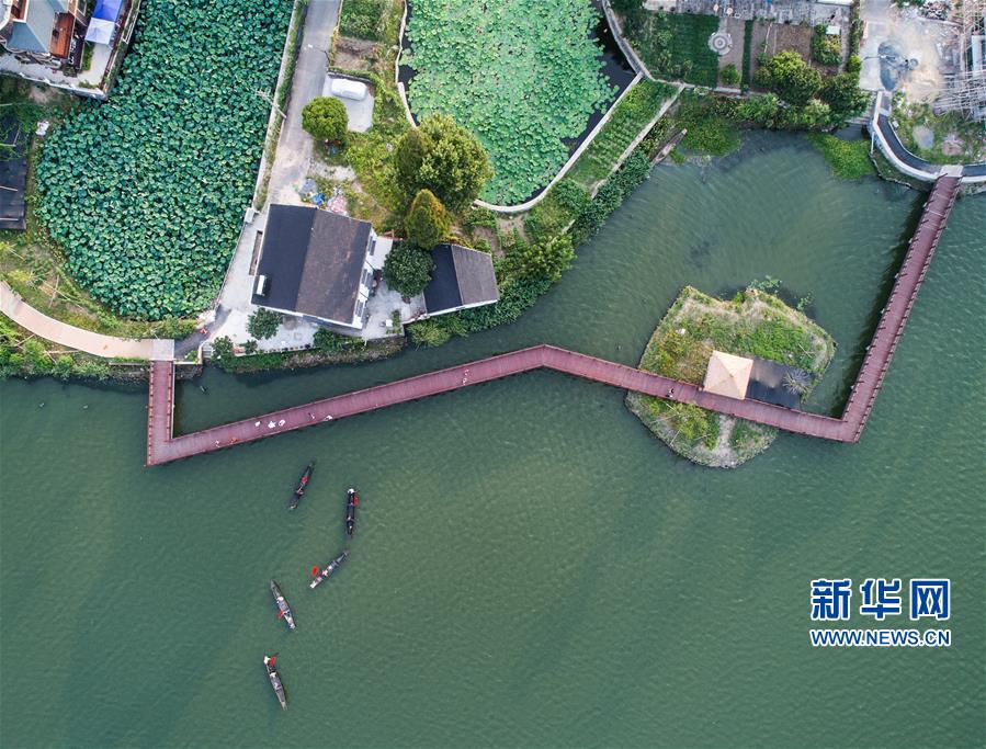 空中俯瞰塘栖镇丁山湖边的水上栈道(8月7日无人机拍摄)。 近年来,杭州市余杭区塘栖古镇将保护原生态自然景观与挖掘展现本地民俗文化相结合,通过新建一条长约10公里的水上栈道,将沿丁山湖的丁山河村、丁河村、超丁村等自然村连接起来,串联各村田园风光和湿地景观,做到一村一景一文化,四季有景色,村村有故事。目前,首期塘栖镇乡村美丽工程已经完工,水上栈道成为古镇村民在炎热夏季纳凉赏景的好去处,也让当地百姓享受到美丽乡村建设和乡村振兴带来的“福利”。 新华社记者 徐昱 摄