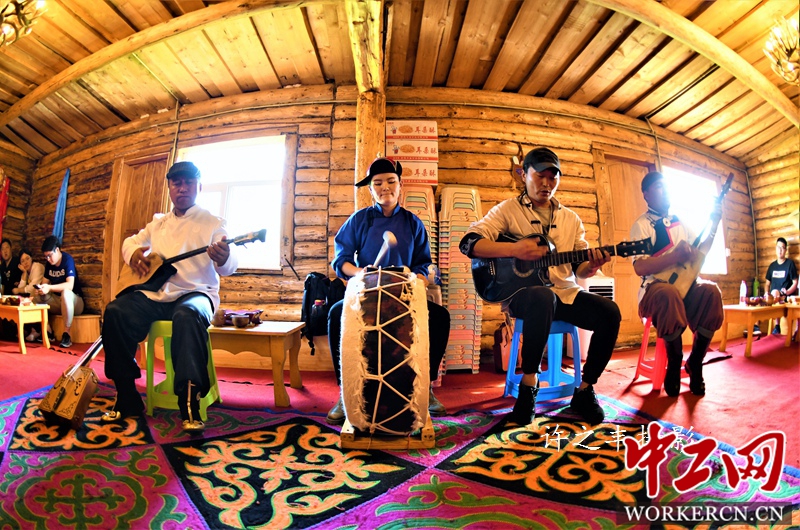 2019年8月7日,走进新疆喀纳斯图瓦人家,他们用最热烈的图瓦人民族表演来迎接尊贵的客人。图瓦人系蒙古族,他们以游牧、狩猎为生。近四百年来,定居喀纳斯湖畔,他们勇敢强悍,善骑术、善滑雪、能歌善舞,现基本保持着比较原始的生活方式,原木垒起的木屋、散布村中、小桥流水、炊烟袅袅、奶酒飘香。古朴的小村景致,像喀纳斯湖一样充满神秘色彩。工人日报-中工网许之丰摄影报道
