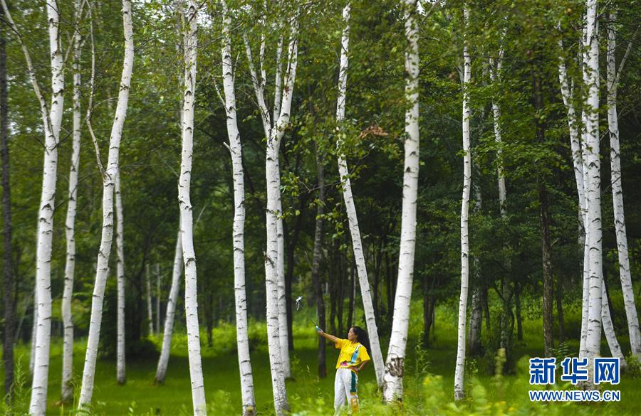 8月8日,游客在伊春市九峰山养心谷景区白桦林里自拍。 时值八月,黑龙江省伊春市林区空气清新,凉爽宜人,吸引众多游客。 新华社记者李晓果摄