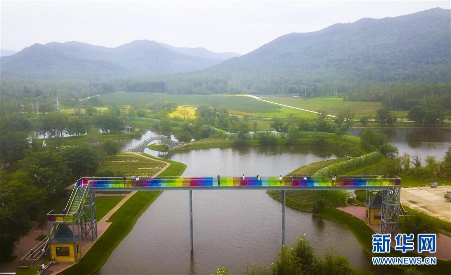 8月8日,游客在伊春市九峰山养心谷景区玻璃栈桥上行走(无人机拍摄)。 时值八月,黑龙江省伊春市林区空气清新,凉爽宜人,吸引众多游客。 新华社记者李晓果摄