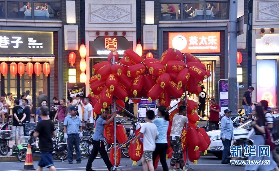 8月7日,北京东城区北新桥附近的商家在搬运装点夜市的灯笼。 北京市东城区依托区域内各具特色的王府井大街、南锣鼓巷、簋街等商圈,举办形式多样的“不夜节”“深夜食堂”等活动,打造大街小巷里的餐饮、夜市、旅游等夜间消费市场,满足市民和游客多元化的消费需求。 新华社记者 李欣 摄