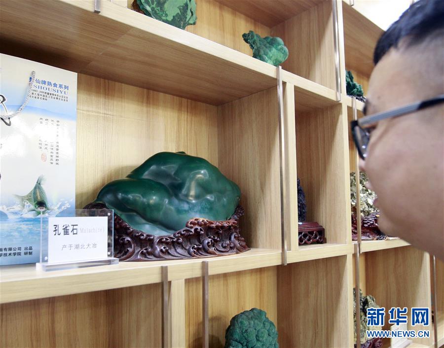 8月8日,游客参观黄石国家矿山公园内展示的产自当地的孔雀石。 新华社记者 姚琪琳 摄