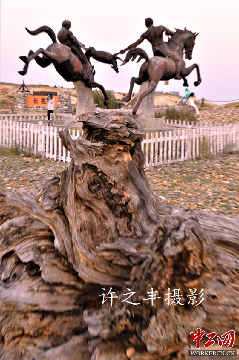五彩滩位于新疆北端的布尔津县境内,地处我国唯一注入北冰洋的额尔齐斯河。河北岸是悬崖式的雅丹地貌,色彩绚烂,形状缤纷,经过千万年风蚀雨剥以及河水的冲刷,在几乎寸草不生的河滩上出现了红、绿、紫、黄、棕等鲜艳的色彩。南岸有绿洲、沙漠与蓝色的天际相合,风光尽收眼底。大自然形成一幅锦绣山河的壮丽图画。图为2019年8月8日的新疆五彩滩景色。工人日报-中工网许之丰摄影报道