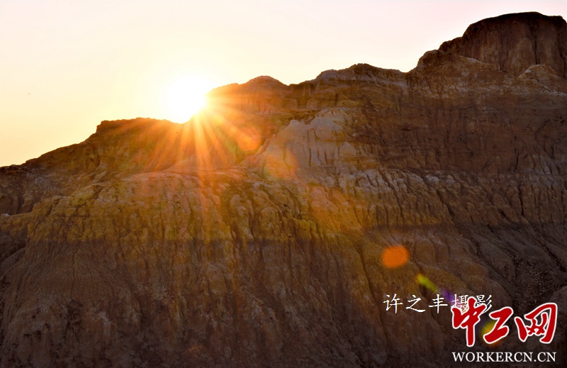 五彩滩位于新疆北端的布尔津县境内,地处我国唯一注入北冰洋的额尔齐斯河。河北岸是悬崖式的雅丹地貌,色彩绚烂,形状缤纷,经过千万年风蚀雨剥以及河水的冲刷,在几乎寸草不生的河滩上出现了红、绿、紫、黄、棕等鲜艳的色彩。南岸有绿洲、沙漠与蓝色的天际相合,风光尽收眼底。大自然形成一幅锦绣山河的壮丽图画。图为2019年8月8日的新疆五彩滩景色。工人日报-中工网许之丰摄影报道