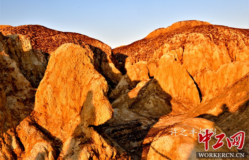 五彩滩位于新疆北端的布尔津县境内,地处我国唯一注入北冰洋的额尔齐斯河。河北岸是悬崖式的雅丹地貌,色彩绚烂,形状缤纷,经过千万年风蚀雨剥以及河水的冲刷,在几乎寸草不生的河滩上出现了红、绿、紫、黄、棕等鲜艳的色彩。南岸有绿洲、沙漠与蓝色的天际相合,风光尽收眼底。大自然形成一幅锦绣山河的壮丽图画。图为2019年8月8日的新疆五彩滩景色。工人日报-中工网许之丰摄影报道