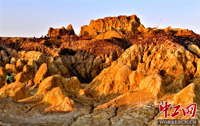 五彩滩位于新疆北端的布尔津县境内,地处我国唯一注入北冰洋的额尔齐斯河。河北岸是悬崖式的雅丹地貌,色彩绚烂,形状缤纷,经过千万年风蚀雨剥以及河水的冲刷,在几乎寸草不生的河滩上出现了红、绿、紫、黄、棕等鲜艳的色彩。南岸有绿洲、沙漠与蓝色的天际相合,风光尽收眼底。大自然形成一幅锦绣山河的壮丽图画。图为2019年8月8日的新疆五彩滩景色。工人日报-中工网许之丰摄影报道