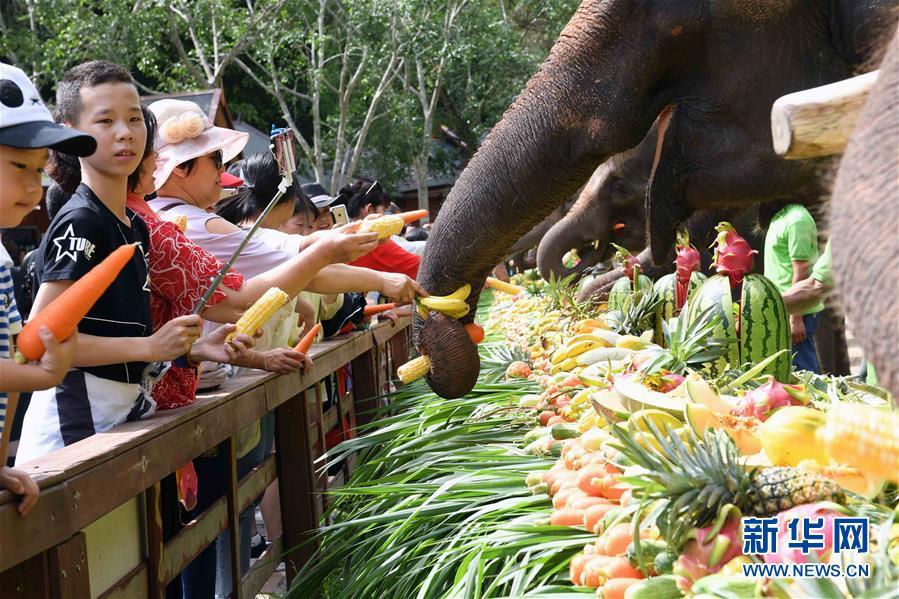 8月12日,游客在西双版纳傣族自治州野象谷景区给亚洲象喂食。 当日是世界大象日。云南省西双版纳傣族自治州野象谷景区举行关爱亚洲象公益活动。来自全国各地的志愿者齐聚野象谷景区,给大象喂食胡萝卜、菠萝、西瓜等,倡议关爱亚洲象,保护其生存环境。 新华社记者 杨宗友 摄