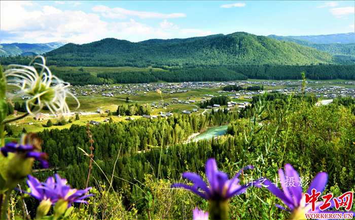 禾木位于新疆布尔津县喀纳斯河与禾木河交汇区的山间断陷盆地中,是中国西部最北端的乡村。禾木自然、原始的山野风光,独美风景。禾木河自东北向西南流淌,原始落村与大草原和谐自然的融为一体。来到禾木村,首先进入我们视野的就是那一栋栋的小木屋和成群结队的牛羊,与雪峰、森林、草地、蓝天、白云构成了独特的自然与文化景观。图为2019年8月7日的新疆禾木。工人日报-中工网许之丰摄影报道
