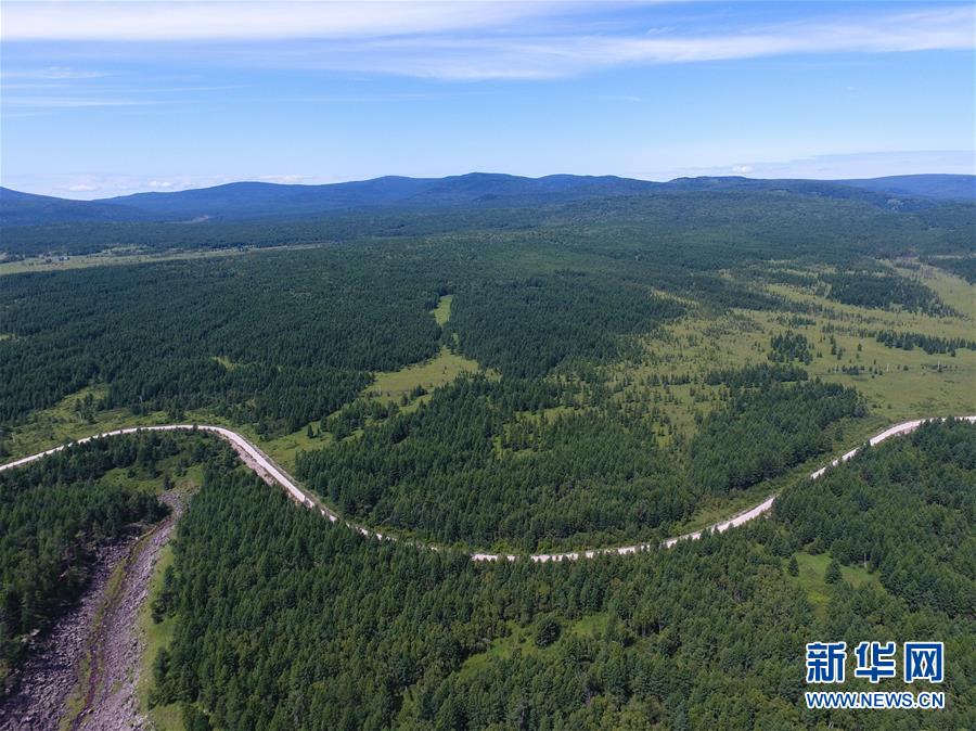 这是阿尔山国家森林公园景区内的公路(8月14日无人机拍摄)。 八月中旬的阿尔山国家森林公园郁郁葱葱,水光山色,景色宜人。 新华社记者 刘磊 摄