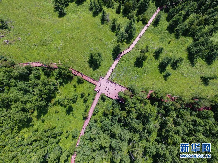 这是阿尔山国家森林公园景区内的一处观景步道(8月14日无人机拍摄)。 八月中旬的阿尔山国家森林公园郁郁葱葱,水光山色,景色宜人。 新华社记者 刘磊 摄