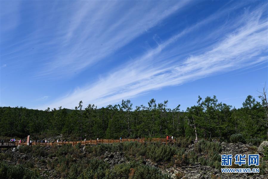 8月14日,游客在阿尔山国家森林公园石塘林景区游玩。 八月中旬的阿尔山国家森林公园郁郁葱葱,水光山色,景色宜人。 新华社记者 刘磊 摄
