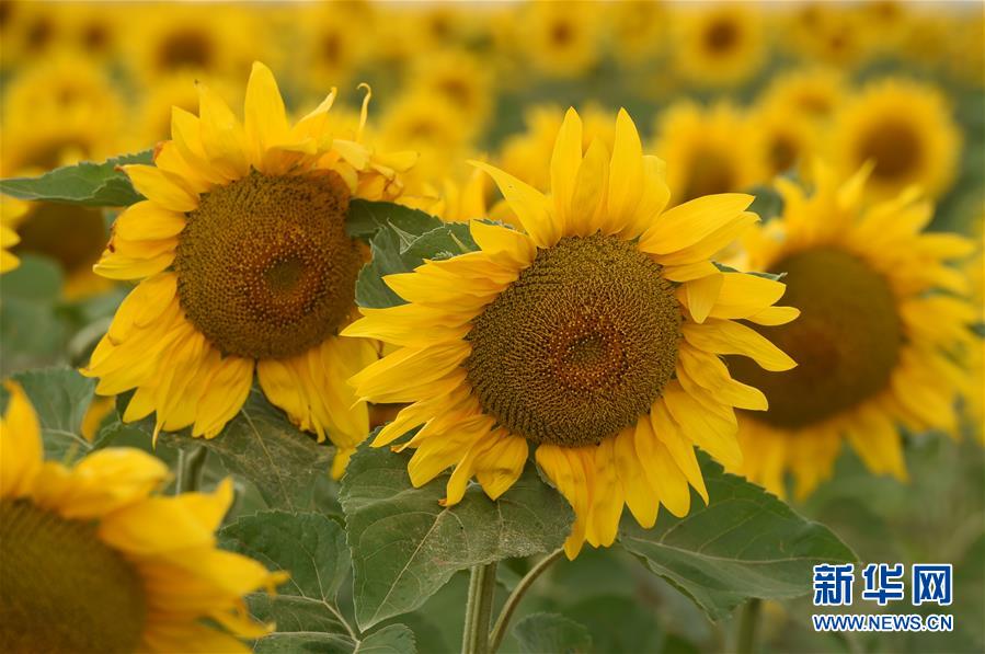 这是在甘肃省白银市景泰县寺滩乡拍摄的向日葵花海(8月13日摄)。 初秋时节,位于甘肃省白银市景泰县寺滩乡的数万亩向日葵竞相绽放,金黄的葵花宛如一张张灿烂的笑脸,让秋日的大地变身美丽画卷。 新华社记者 范培珅 摄