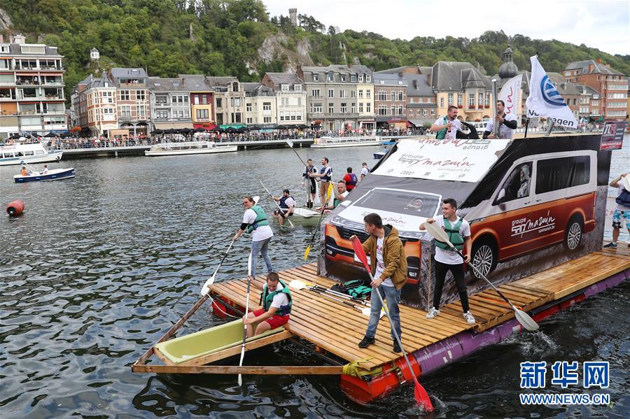 8月15日,在比利时南部小城迪南的默兹河上,人们参加“浴缸划船节”的表演。 新华社记者 张铖 摄