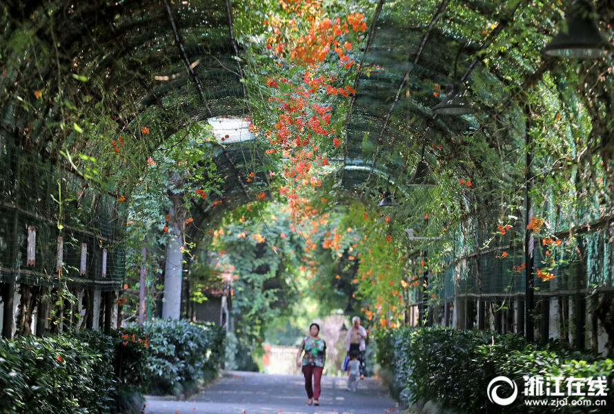 浙江在线8月15日讯(浙江在线记者 林云龙 拍友 钱洪华 摄)8月15日,杭州田园社区在凌霄长廊下举办“民星”大舞台活动,居民们在绿荫蔽日、繁花盛开的长廊里乐享生态社区的夏日风情。该社区2013年构建了长达200米的网架长廊,经过七年精心养护,数百棵凌霄藤蔓已爬满5米高的网架,七、八月份金黄色的凌霄花盛开之时,成为炎炎夏日里一道清凉宜人的别样风景。